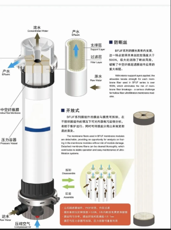 Rawatan air ultrafiltrasi adalah teknologi pemisahan membran antara mikrofiltrasi dan nanofiltrasi. Ia menggunakan perbezaan tekanan sebagai daya penggerak, menggunakan membran serat berongga dengan saiz liang 0.01-0.1 μm untuk memintas koloid, bakteria, virus, dan beberapa bahan organik di dalam air. Kelebihan terasnya adalah: